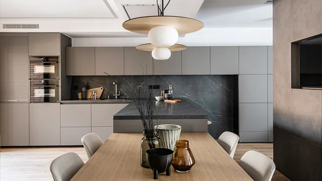 Este nuevo reto llevado a cabo por Clysa, precisaba un giro de 360º en su diseño ya que su finalidad había cambiado por completo. Se replanteó la distribución de todos los espacios creando una conexión entre cocina, comedor y sala de estar para convertirlo en el núcleo del hogar que es ahora. Para conseguir una cocina confortable, práctica y vanguardista, se ha incorporado la pionera placa de inducción Cooking Surface, completamente integrada en la encimera de porcelánico generando una superficie sin juntas o cortes que propone la encimera como una superficie completa de trabajo para disfrutar cada centímetro. El modelo seleccionado es Pietra Grey en el acabado soft con efecto seda al tacto, que combina a la perfección con los tonos piedra y madera del resto del espacio creando un ambiente tranquilo y luminoso.