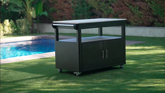 El sistema de inducción Outdoor Cooking con 3 zonas de cocción está totalmente integrado en material porcelánico italiano de ABK Stone y se compone por una estructura de acero con ruedas giratorias con freno, un mando de control integrado y una bandeja extraíble, también de porcelánico, para maximizar la superficie de trabajo.