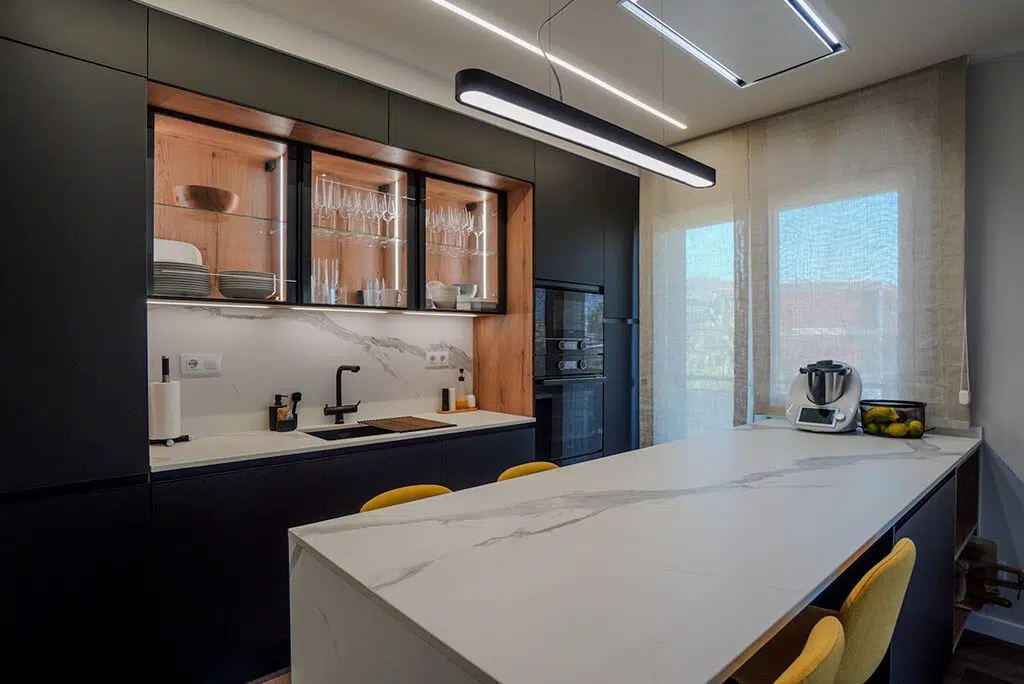 Pero hay que tener en cuenta algunas cosas. Es importante asegurarse de que la habitación sea lo suficientemente grande como para albergar esta distribución y que dé sensación de amplitud. En segundo lugar, hay que planificar bien la distribución de todos los elementos para maximizar el espacio y la funcionalidad, por ejemplo, el uso de taburetes o la altura de la encimera con la que se puede jugar o combinar, mezclando una encimera de altura estándar con otra tipo barra de bar con taburetes altos para que haga el efecto de un desayunador.