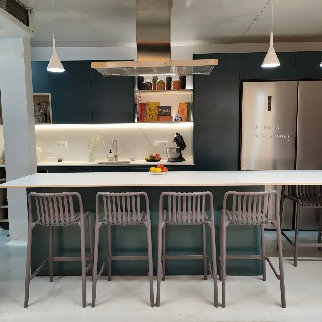 The design includes a bar-style island, ideal for gatherings around the kitchen. The modern high chairs in grey tones match the neutral color palette, while pendant lamps provide warm, direct lighting over the bar, adding a functional and decorative element. LED lighting under the upper cabinets highlights the porcelain and offers a soft, continuous glow that adds depth to the kitchen. This design focuses on practicality and comfort, creating a perfect daily environment without sacrificing style.