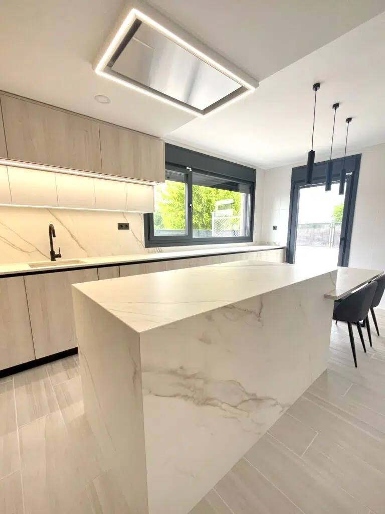 Impressive modern kitchen that combines elegance and functionality with a contemporary design. This kitchen stands out for its use of Calacatta Gold porcelain with an integrated invisible induction system. The porcelain countertop is not only aesthetically appealing but also offers durability and resistance, making it ideal for kitchen work surfaces.