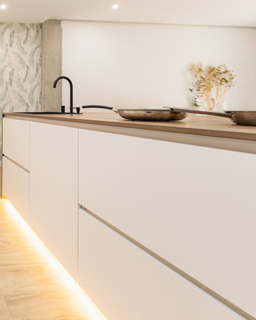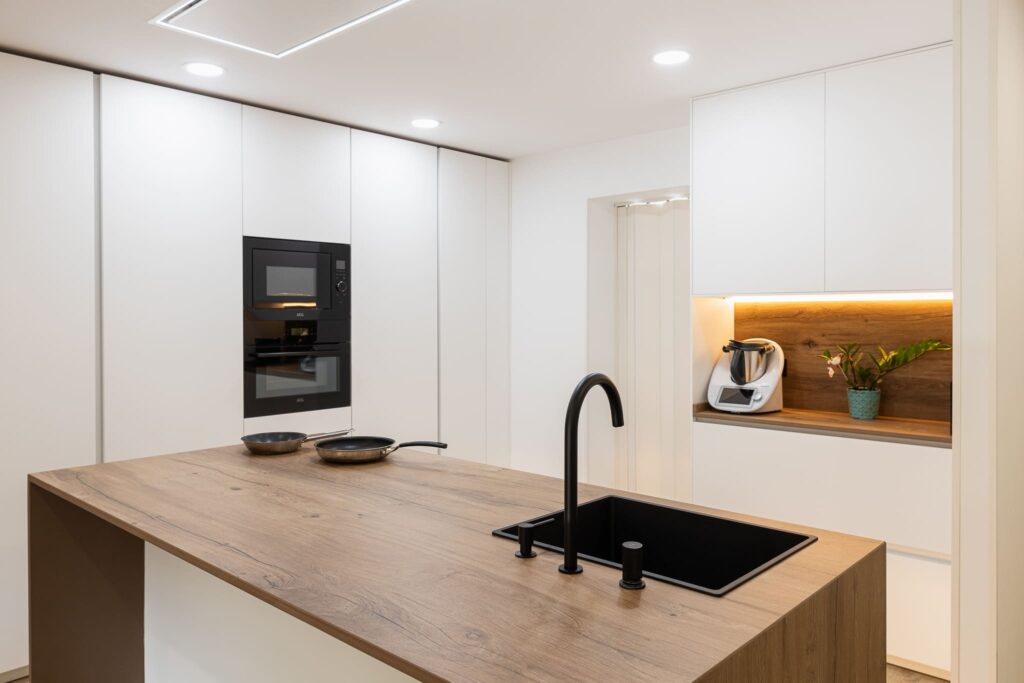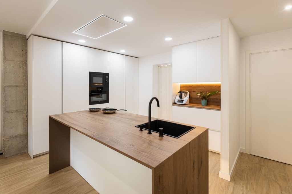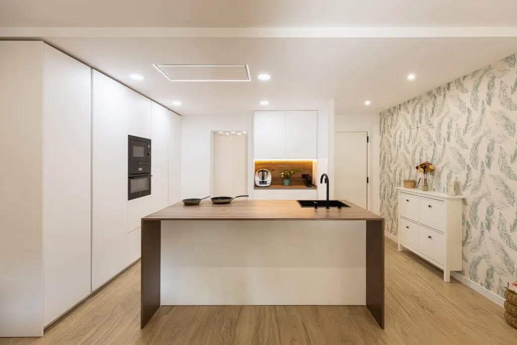 The composition is completed with matte white cabinetry featuring clean lines and wooden accents, arranged in an open layout that enhances connection with the dining and living areas. The central island becomes the heart of daily activity, functioning as a space for preparation, cooking, and informal dining.