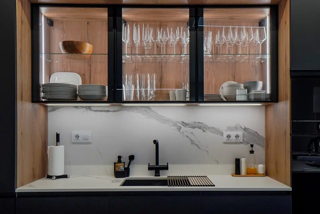 Une autre alternative au dosseret est le verre trempé pour le devant de la cuisine. Ce matériau est également facile à nettoyer et résistant à la chaleur. De plus, la combinaison de matériaux lui confère un côté moderne, rendant le dosseret inutile.
