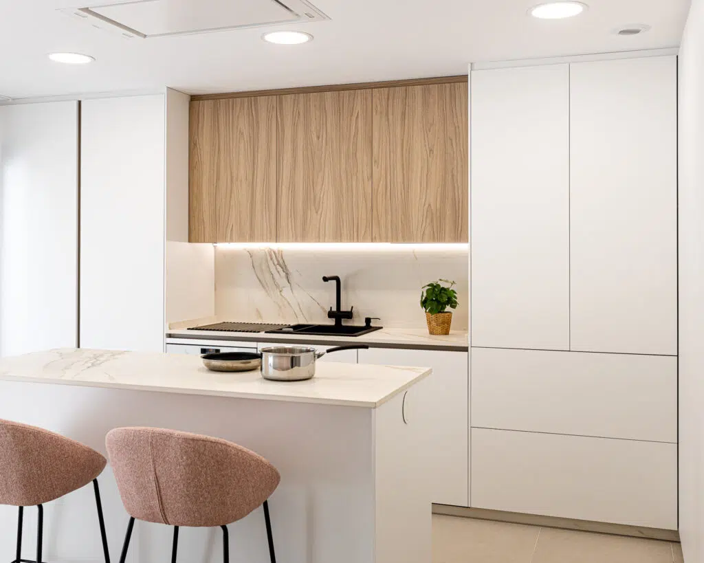 Cuisine blanche avec îlot central ouverte sur le salon, réalisée par Tiendas Decormobiliario à Málaga.