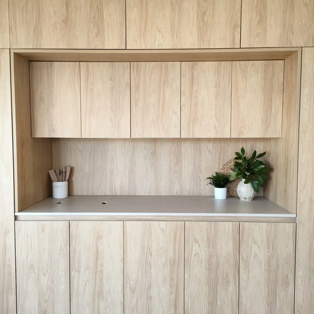 Pour le plan de la cuisine, nous avons choisi le modèle en grès cérame Trani Beige, qui allie parfaitement une esthétique chaleureuse et moderne. La finition dans les tons pierre apporte une touche de sophistication et de sérénité, idéale pour créer une atmosphère accueillante et fonctionnelle. Les armoires en bois clair, sans poignées apparentes, renforcent le style minimaliste, optimisant l’espace de rangement sans rompre l’harmonie visuelle.
