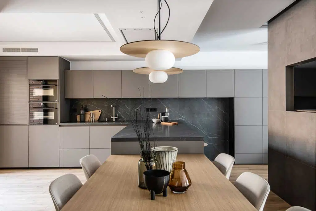 La cuisine, l’un des espaces les plus remarquables du projet, intègre une technologie de pointe grâce à la plaque de induction invisible Cooking Surface, entièrement intégrée dans le plan de travail en céramique ABKSTONE. Le modèle choisi, Pietra Grey, se distingue par son élégance sobre et s’harmonise parfaitement avec les tons gris de l’environnement et la chaleur du bois.