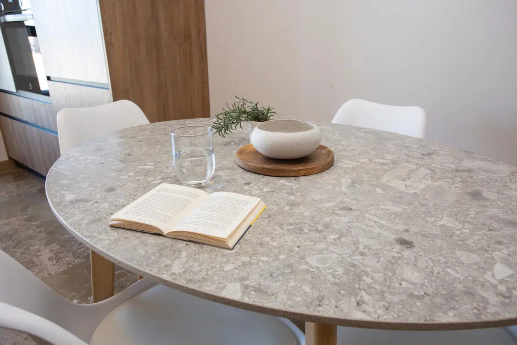 Le design se complète par un espace repas intégré, mettant en scène une table circulaire fabriquée dans le même matériau que le plan de travail, renforçant ainsi la continuité visuelle et créant un environnement cohérent et convivial pour le quotidien.