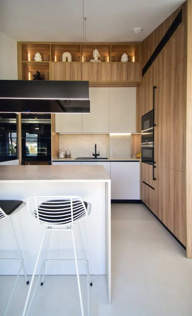 Le mobilier combine des façades en bois à veinure naturelle avec des modules laqués blanc mat, apportant un rythme visuel et un équilibre des textures. La péninsule, équipée du système d’induction invisible orientée vers l’extérieur de l’espace, fait office de surface d’appui, de point de rencontre et de pièce maîtresse du projet. S’y ajoute une hotte suspendue au design linéaire, qui renforce le caractère scénique de l’ensemble sans rompre sa pureté formelle.