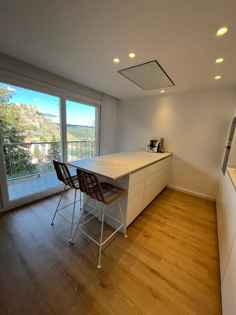 De plus, l’îlot est équipé du système innovant système innovant d’induction invisible, permettant de cuisiner directement sur la surface, tout en préservant la propreté visuelle du design et en maximisant l’espace. Le sol en bois apporte de la chaleur, tandis que les meubles blancs assurent une ambiance lumineuse et équilibrée. Ce projet de NM Cuines Miralles illustre comment le design contemporain peut allier praticité et beauté dans un espace unique.