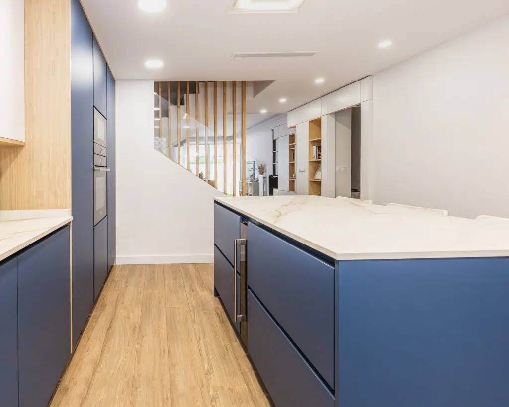 Le design de cette cuisine se caractérise par l’harmonie des textures : les armoires bleues combinées aux placards blancs supérieurs créent une esthétique fraîche et contemporaine, tandis que le grès cérame effet marbré des plans de travail et du dosseret apporte une touche de luxe. Les détails dorés, tels que le robinet de l’évier, complètent parfaitement les veines dorées du grès cérame. La disposition en L et l’îlot central offrent une grande fonctionnalité et un espace de travail généreux, idéal pour la préparation des repas et les moments de convivialité.