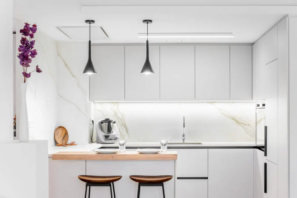 Pour ce projet de cuisine de petite taille, des tonalités et des détails en blanc ont été choisis pour créer un espace lumineux et une sensation d’amplitude. De plus, pour ajouter une touche sophistiquée et plus de personnalité, un plan de travail et un revêtement mural en grès cérame Calacatta Gold d’ABKSTONE ont été conçus, intégrant le système de cuisson révolutionnaireCooking Surface.