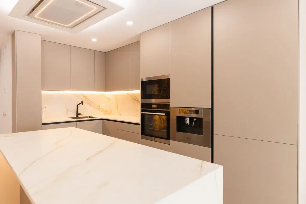L’arredamento in finitura opaca color tortora, privo di maniglie, rafforza l’estetica minimalista, mentre l’illuminazione incassata aggiunge calore all’insieme ed esalta le sfumature naturali del gres porcellanato.