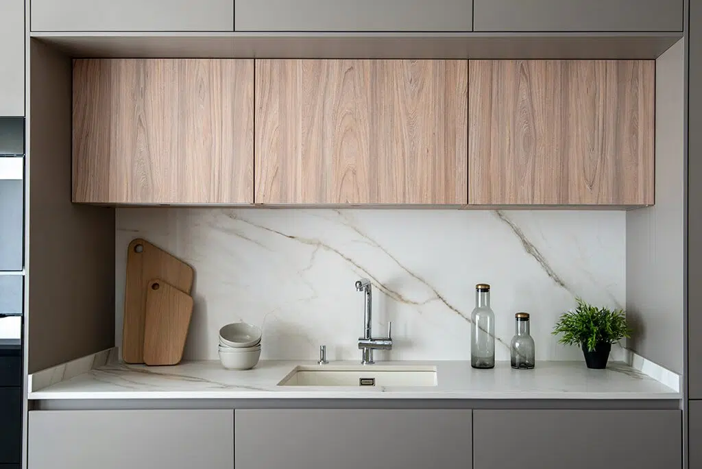 Esta cocina abierta al salón destaca por su majestuosa isla con encimera de porcelánico de ABKSTONE en el modelo Calacatta Gold que incorpora la placa de inducción 100% invisible Cooking Surface optimizando la superficie de trabajo.