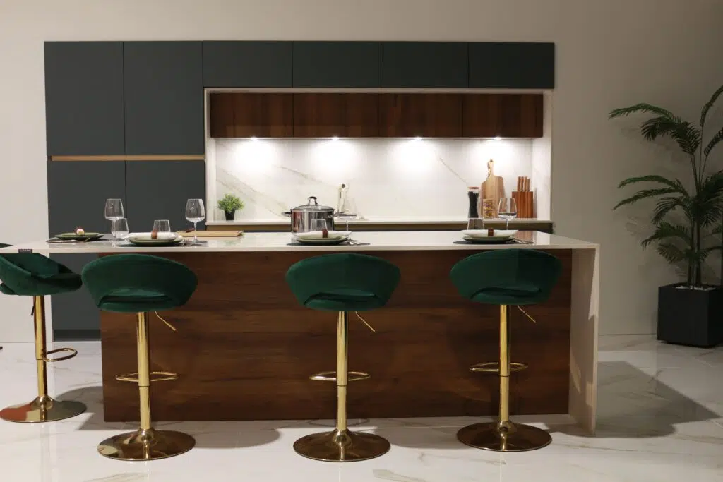 El mobiliario mural, en tono gris petróleo mate, se combina con la calidez de la madera, generando contraste y profundidad. La iluminación integrada en la parte superior del nicho refuerza la textura del aplacado y crea una atmósfera envolvente. Los taburetes en terciopelo verde con base dorada aportan un guiño sofisticado al conjunto, reforzando la identidad escénica del espacio.