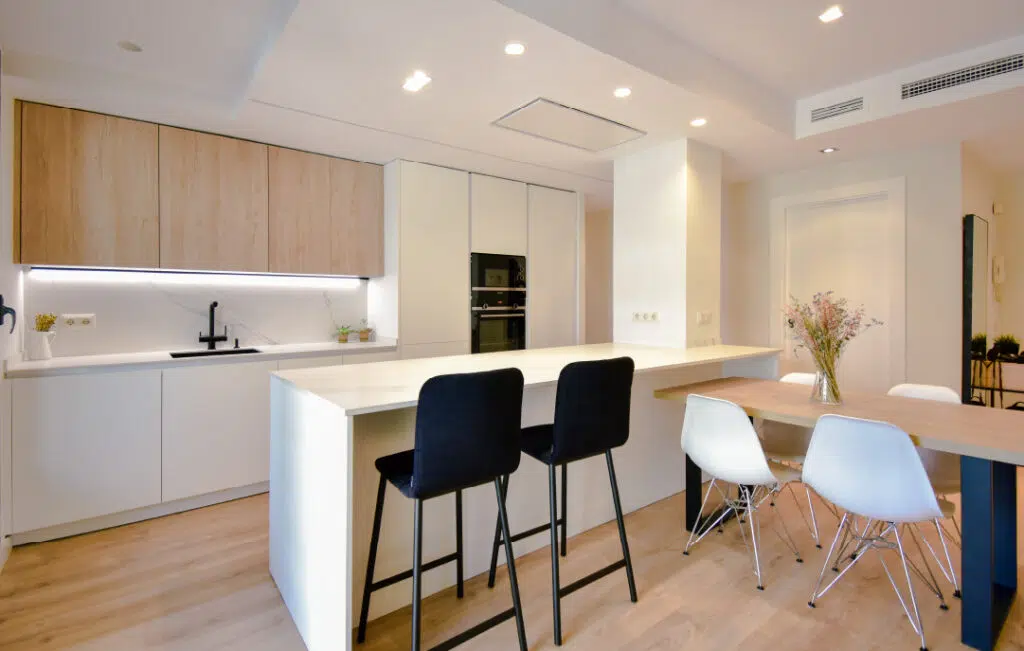 El mobiliario se resuelve en blanco mate con detalles en madera clara, que aportan equilibrio cromático y calidez. La grifería negra y la iluminación lineal bajo mueble añaden detalles técnicos al conjunto, mientras que la península cumple una doble función: zona de cocción y barra para comidas informales.