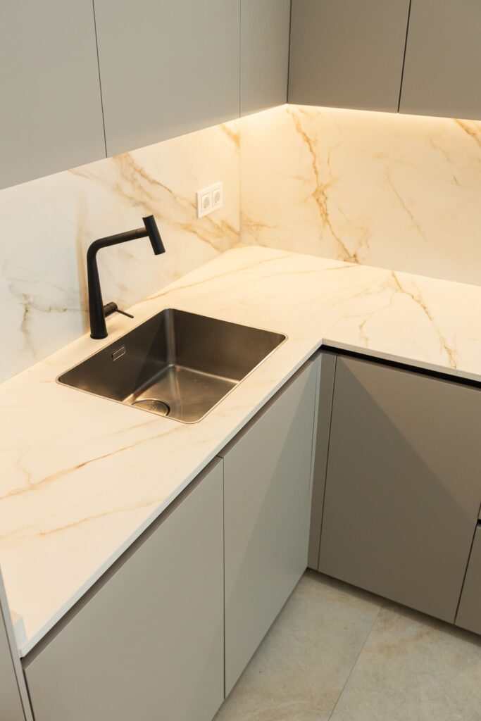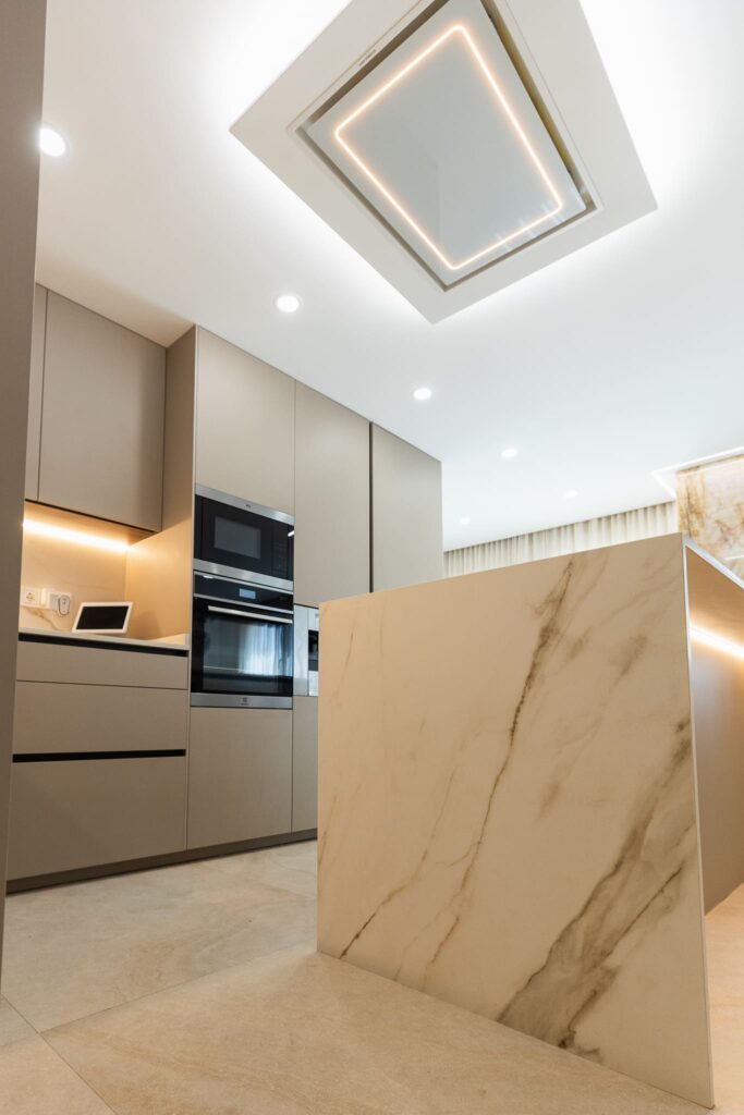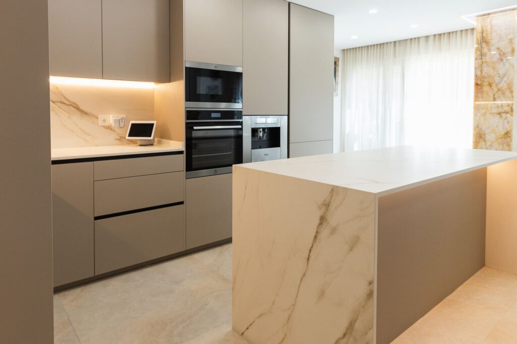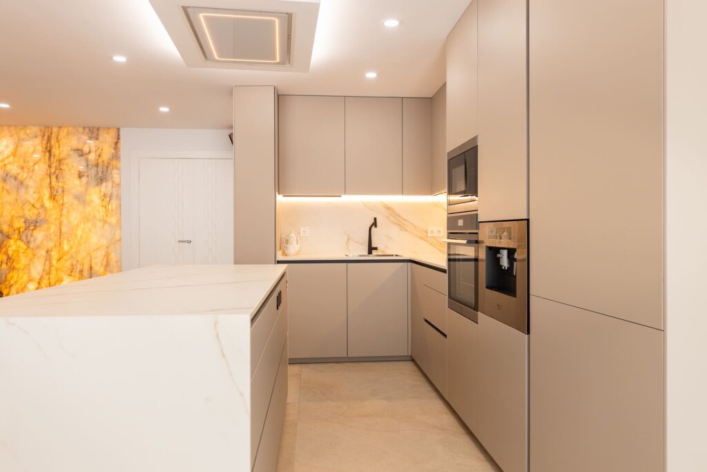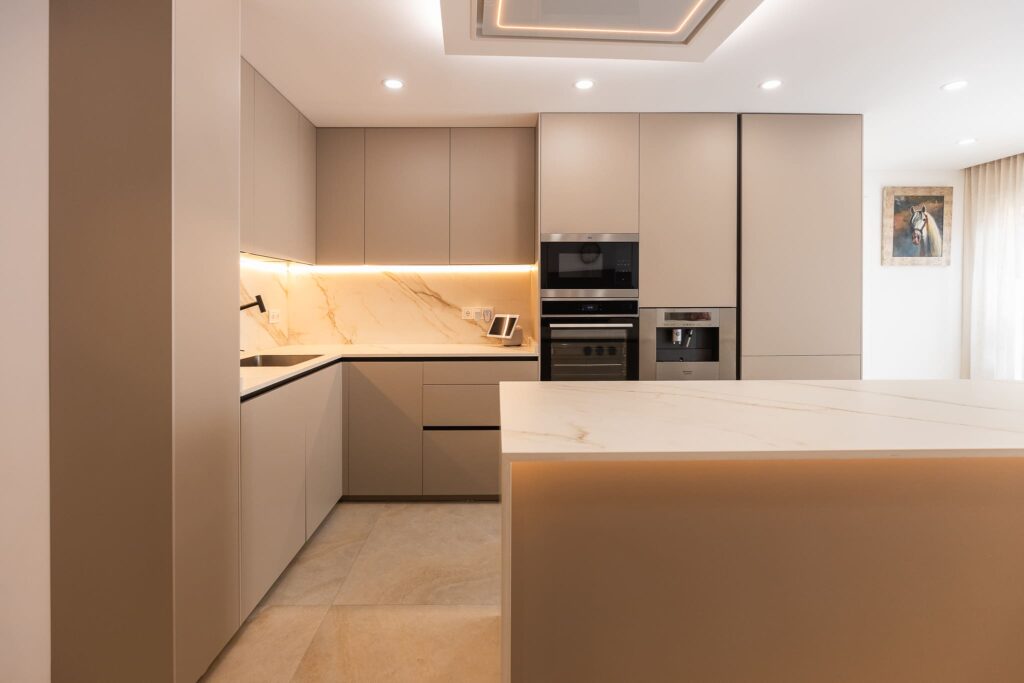 El mobiliario en acabado mate topo se ha diseñado sin tiradores para reforzar una estética minimalista, mientras que la iluminación empotrada aporta calidez al conjunto, resaltando los matices del porcelánico.