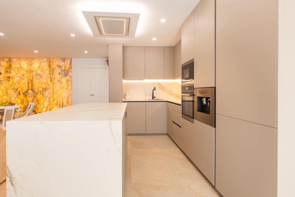 Elegancia atemporal y líneas puras definen esta cocina con isla realizada por la tienda Decormobiliario, donde el protagonismo absoluto recae en la superficie Calacatta Gold de ABKSTONE. Una propuesta sofisticada que combina estética y funcionalidad en una vivienda particular, apostando por una composición abierta y contemporánea.