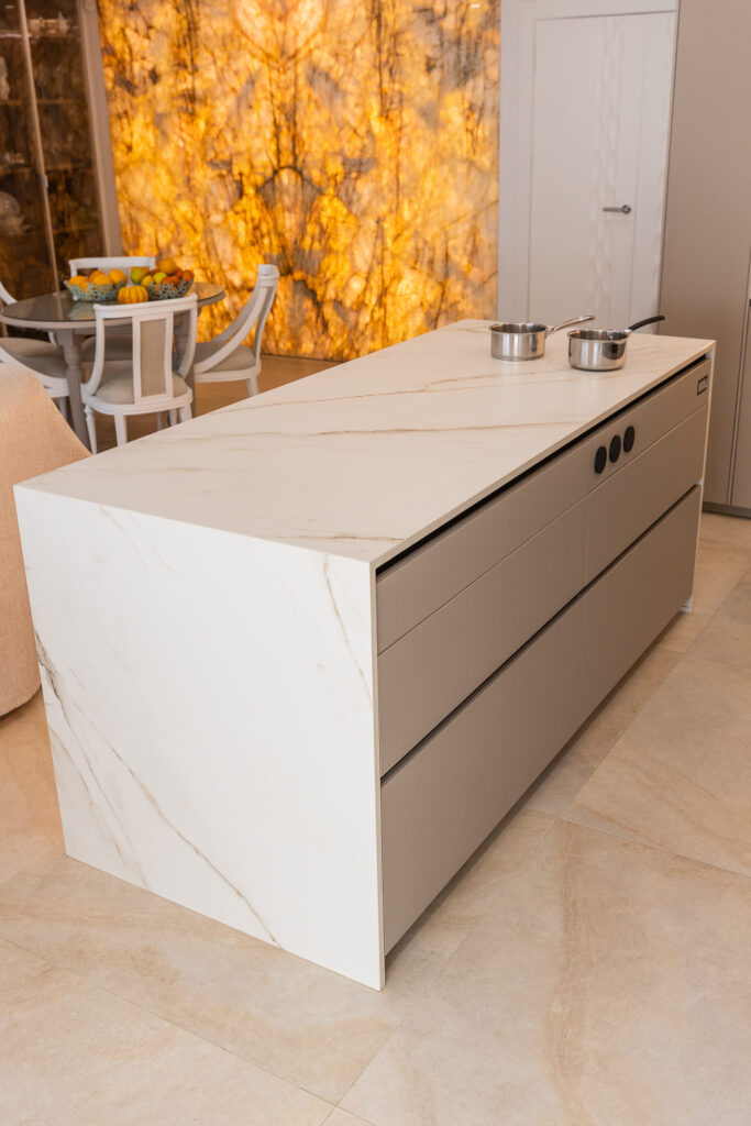 El porcelánico Calacatta Gold, de gran formato y vetas doradas sobre fondo blanco marfil, recorre la encimera principal, el frente de cocina y la isla central, generando una continuidad visual envolvente. Esta última no solo actúa como punto focal del diseño, sino también como superficie de trabajo y área de encuentro informal, ideal para disfrutar en el día a día.