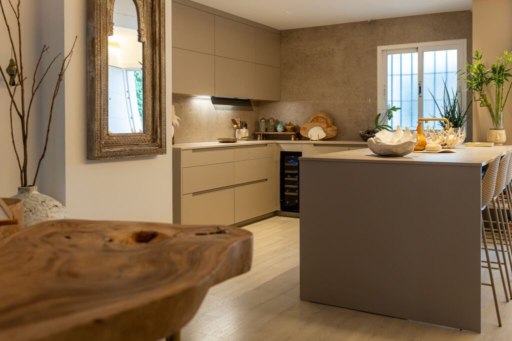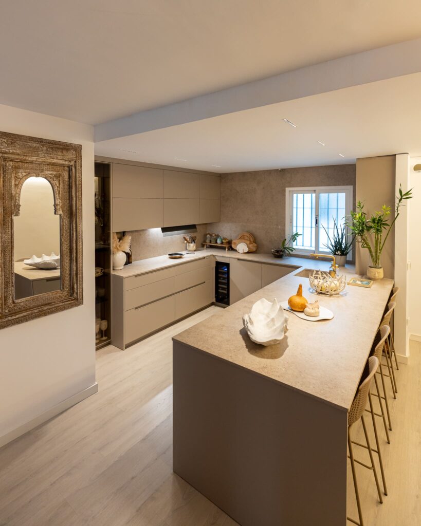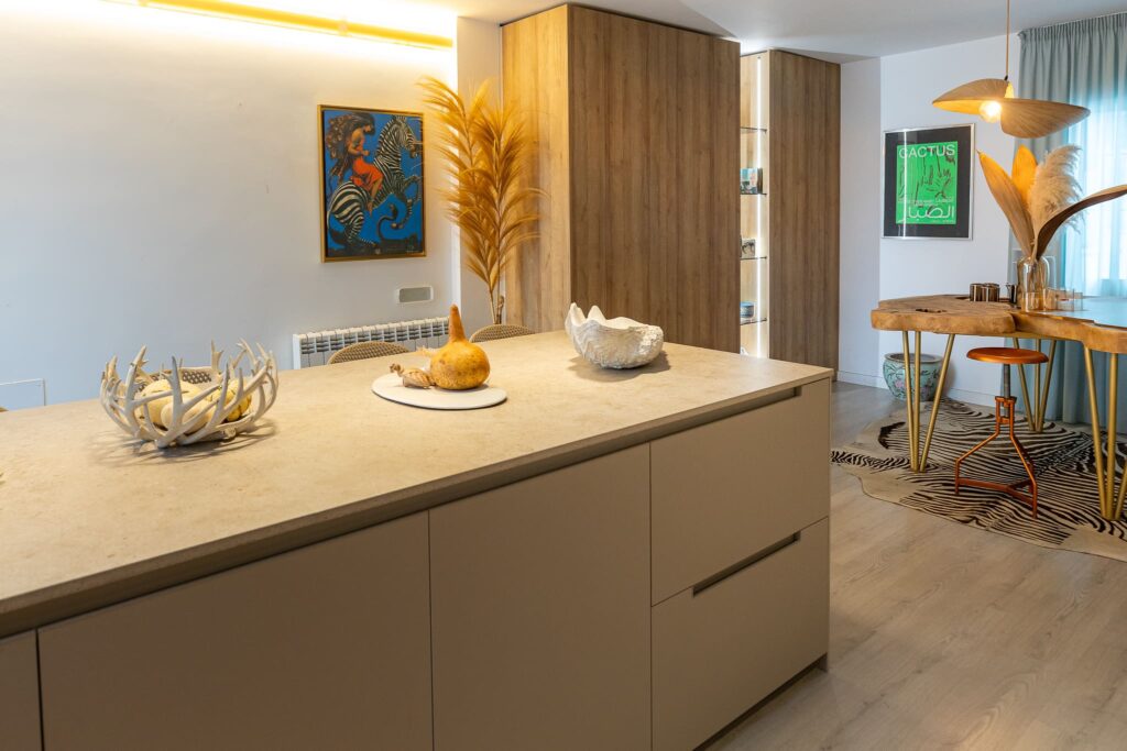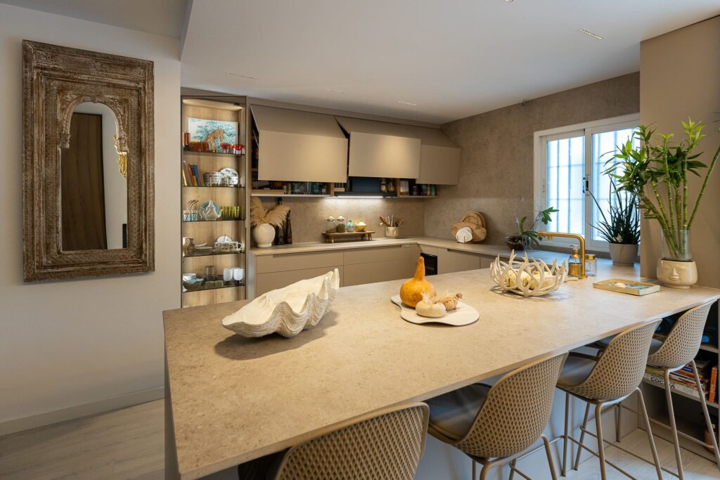 Este proyecto de cocina en tonos tierra ha sido concebido para una vivienda particular como un espacio cálido, elegante y altamente funcional. El mobiliario, en acabado visón mate y sin tiradores, aporta limpieza visual y una estética contemporánea que se integra a la perfección con el porcelánico técnico Anima Beige de ABKSTONE, presente en la encimera, el frente mural y la gran isla central.