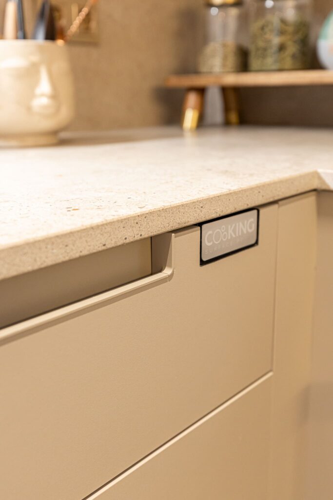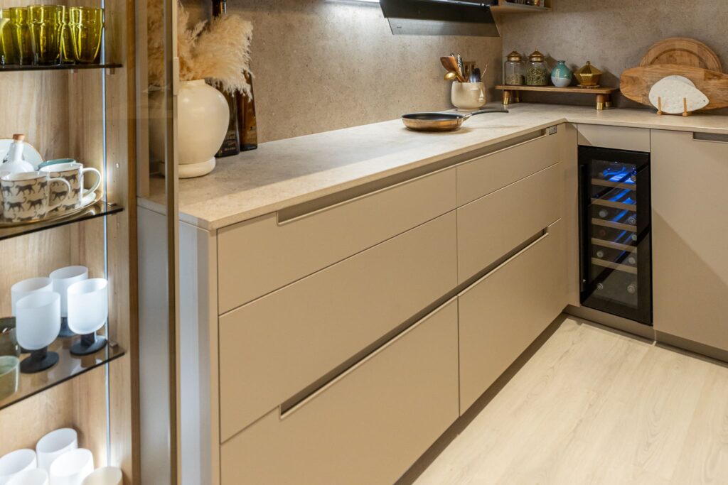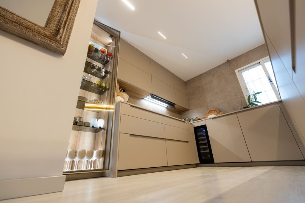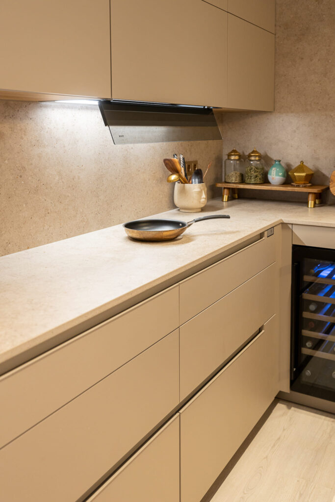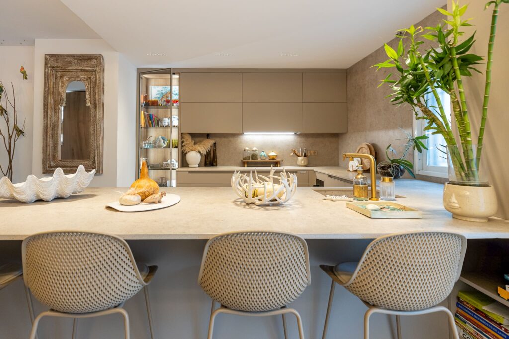 Este proyecto de cocina en tonos tierra ha sido concebido para una vivienda particular como un espacio cálido, elegante y altamente funcional. El mobiliario, en acabado visón mate y sin tiradores, aporta limpieza visual y una estética contemporánea que se integra a la perfección con el porcelánico técnico Anima Beige de ABKSTONE, presente en la encimera, el frente mural y la gran isla central.