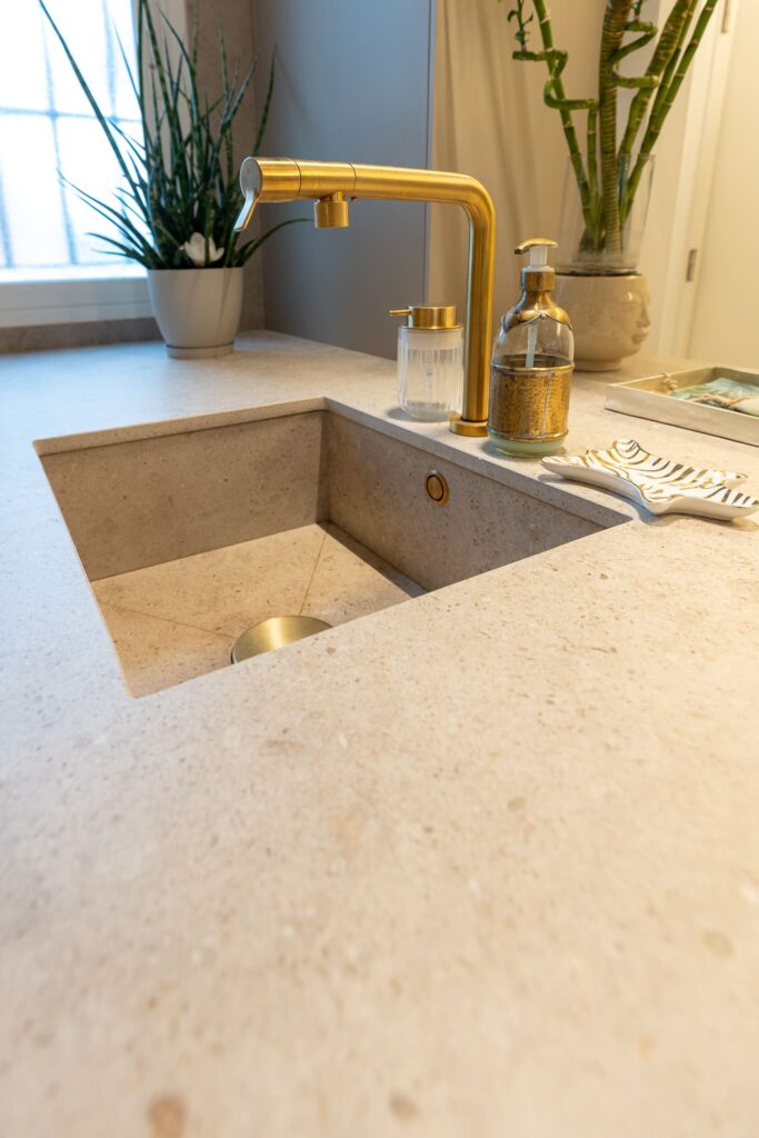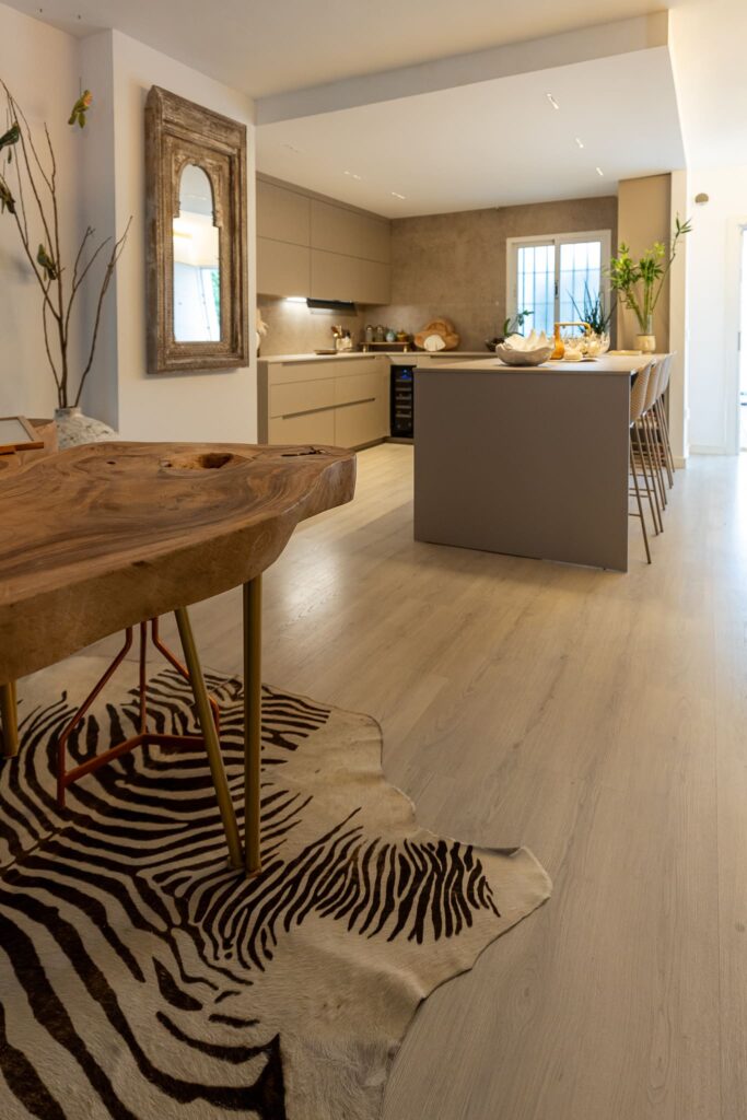 La distribución abierta con isla favorece la conexión entre cocina y comedor, generando un entorno fluido ideal para la vida familiar y social. La isla, equipada con fregadero y grifería en dorado cepillado, actúa como superficie de trabajo y punto de encuentro, destacando como elemento central del diseño.