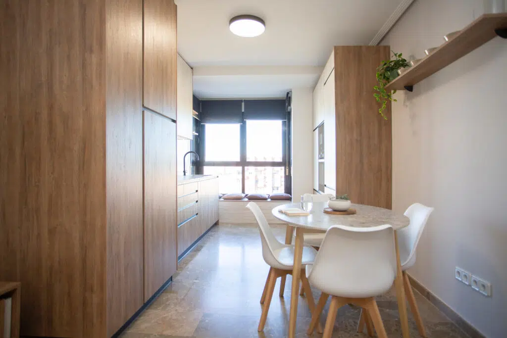 El diseño se completa con una zona de office integrada, protagonizada por una mesa circular fabricada en el mismo material que la encimera, lo que refuerza la continuidad visual del espacio y lo convierte en un entorno cohesionado y acogedor para el día a día.