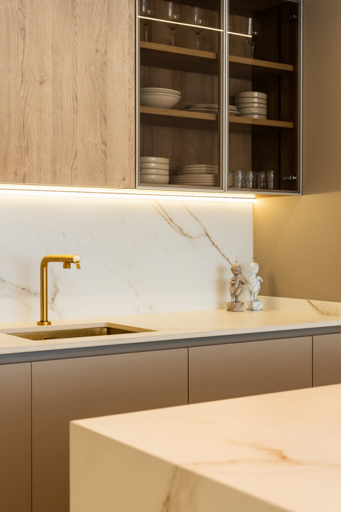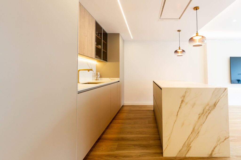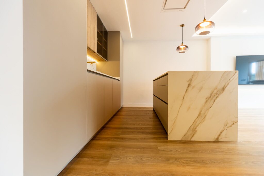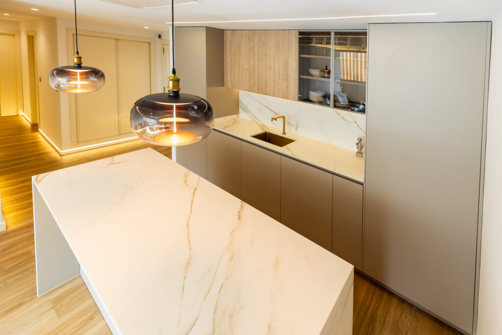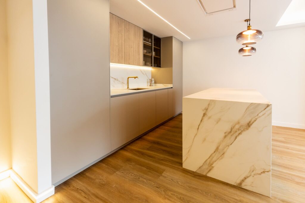 El porcelánico Calacatta Gold de ABKSTONE, con su veteado cálido y natural, reviste tanto la encimera como el frente y la isla, creando una composición homogénea y muy sofisticada. La isla central actúa como punto de encuentro, superficie de trabajo y barra para desayunos, integrándose visualmente con el salón gracias a la continuidad estética del mobiliario.