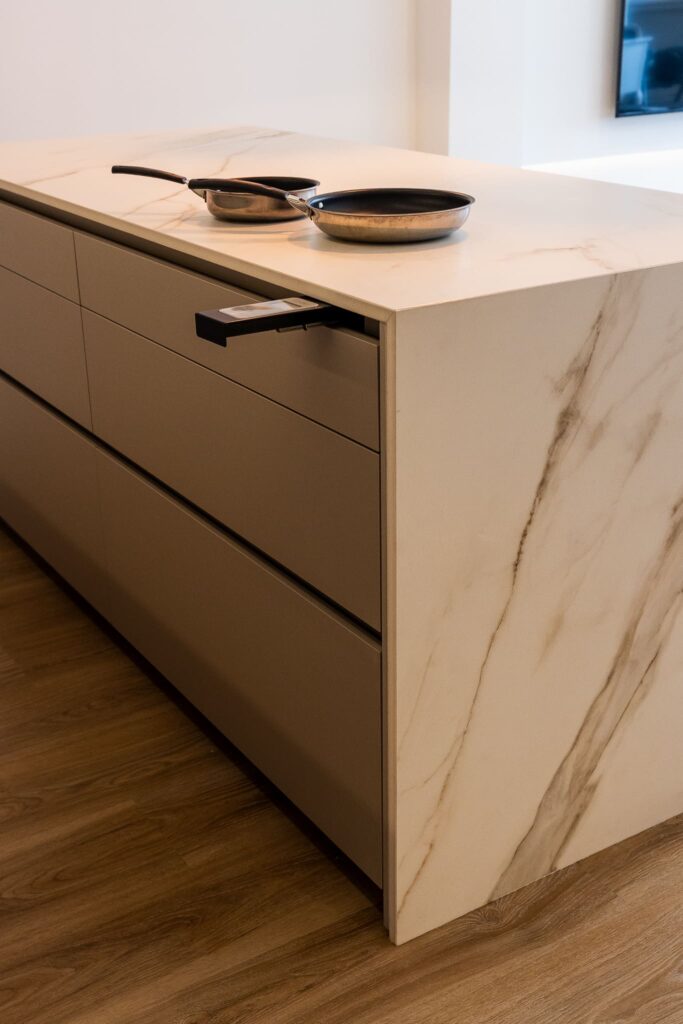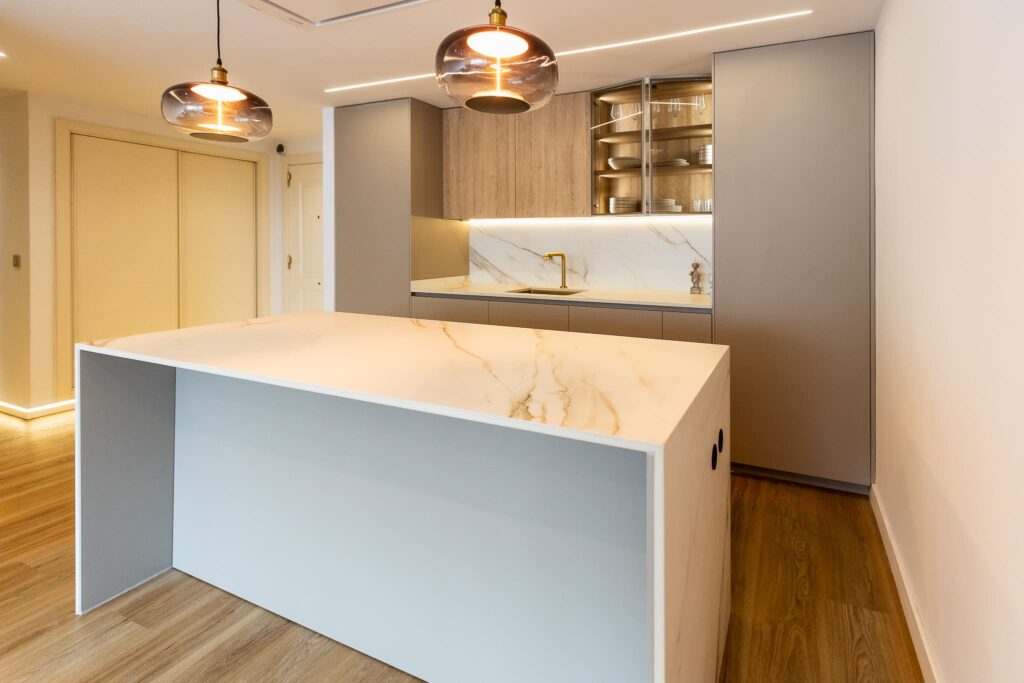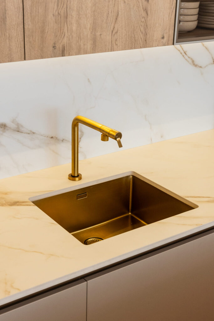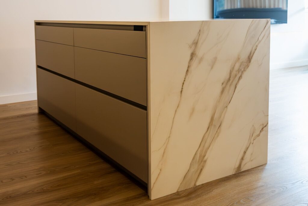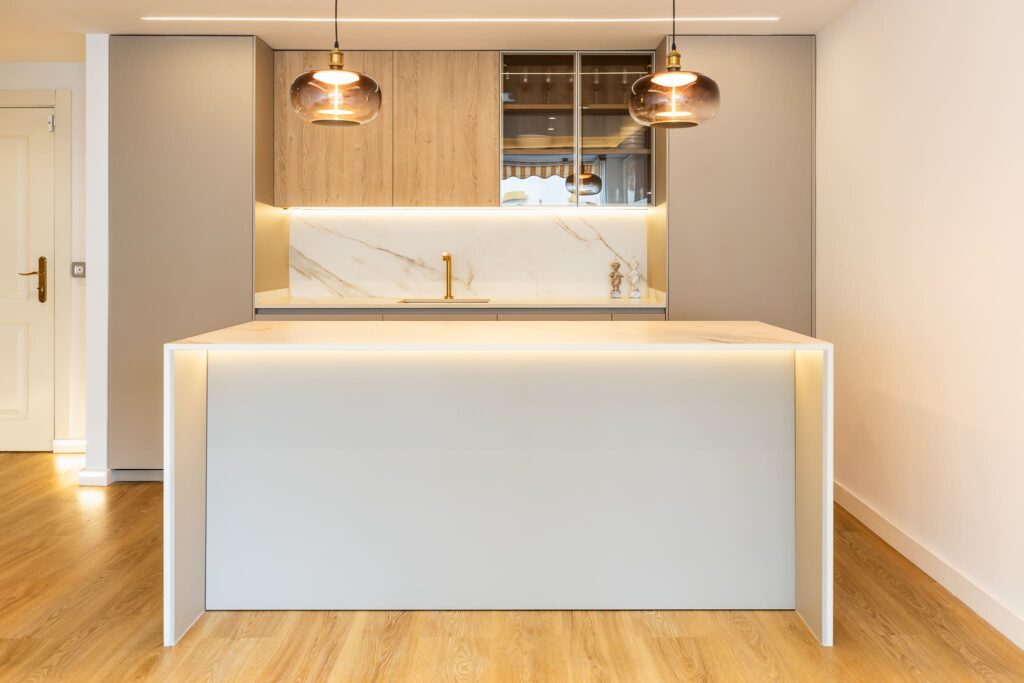 El porcelánico Calacatta Gold de ABKSTONE, con su veteado cálido y natural, reviste tanto la encimera como el frente y la isla, creando una composición homogénea y muy sofisticada. La isla central actúa como punto de encuentro, superficie de trabajo y barra para desayunos, integrándose visualmente con el salón gracias a la continuidad estética del mobiliario.