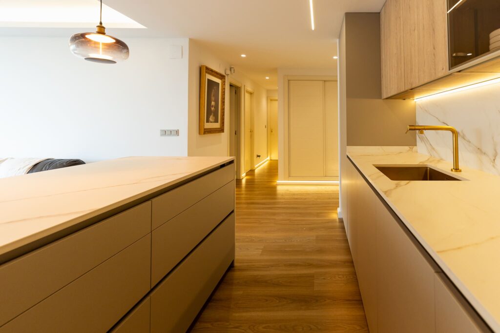 La distribución abierta y lineal, combinada con los tonos neutros del mobiliario, proporciona luminosidad y amplitud al espacio. Esta cocina no solo destaca por su belleza atemporal, sino por su practicidad diaria, reflejo de una planificación eficiente y un diseño contemporáneo adaptado al estilo de vida actual.