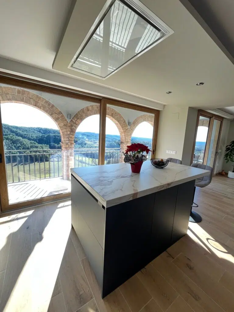 La isla central no solo actúa como un elemento decorativo, sino que también integra un sistema de inducción invisible, garantizando una superficie completamente uniforme y despejada. Este innovador diseño no solo optimiza el espacio de trabajo, sino que también convierte la isla en un punto de encuentro ideal para reuniones y momentos compartidos.