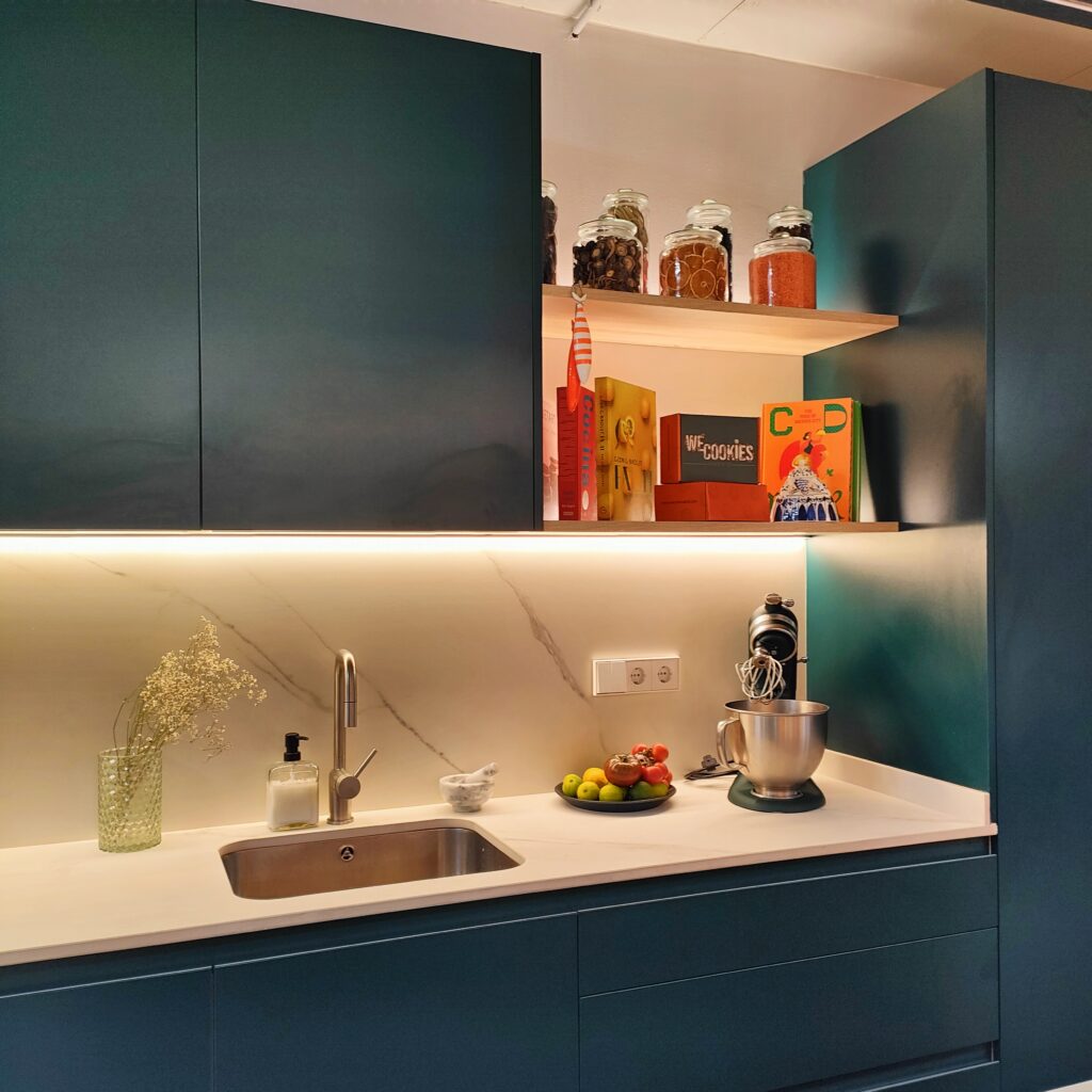 El diseño incluye una isla tipo barra, ideal para reuniones en torno a la cocina. Las sillas altas de estilo moderno en tono gris combinan con la paleta de colores neutros, mientras que las lámparas colgantes proporcionan una iluminación directa y cálida sobre la barra, añadiendo un elemento decorativo moderno y funcional. La iluminación LED bajo los muebles altos realza el porcelánico y ofrece una luz suave y continua que da mayor profundidad a la cocina. Este diseño se enfoca en la practicidad y el confort, logrando un ambiente perfecto para el día a día sin sacrificar el estilo.