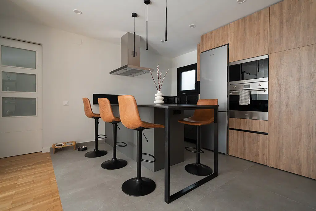 Cocina negra con isla que combina la elegancia y calidez de la madera con la sofisticación del mármol negro creando un nuevo espacio más amplio y funcional.