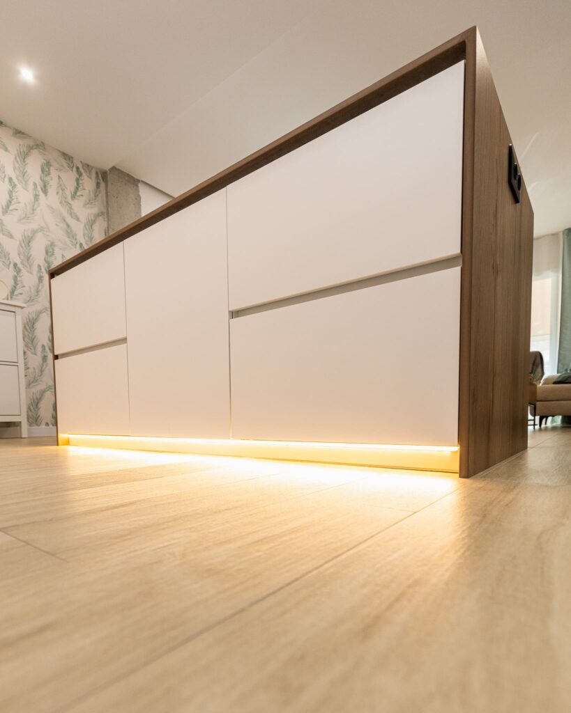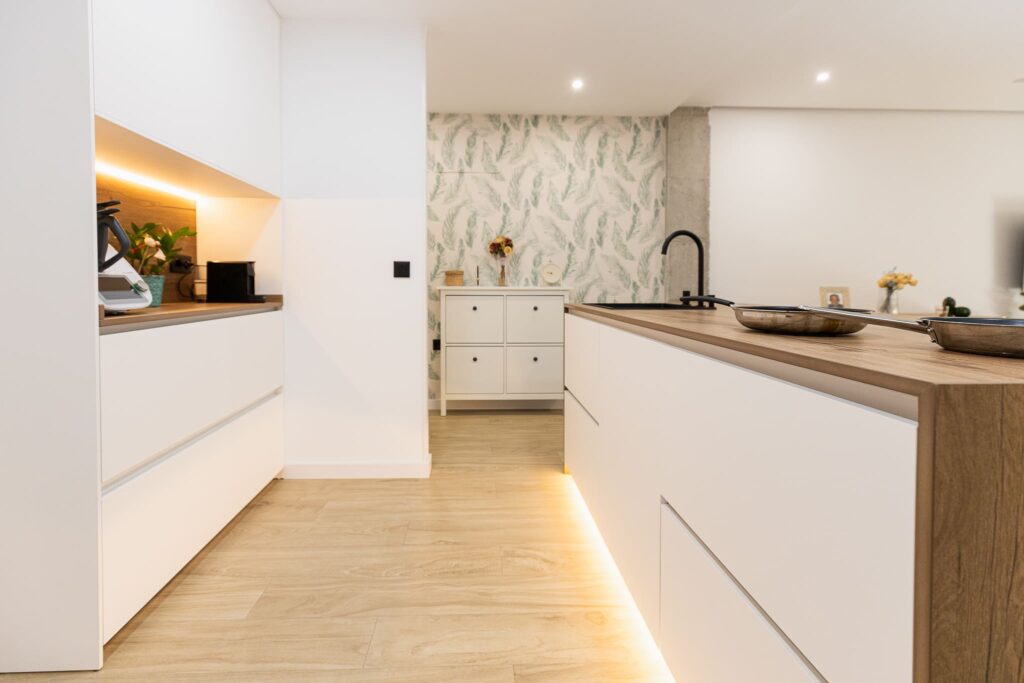 La composición se completa con mobiliario blanco mate de líneas puras y detalles en madera, en una distribución abierta que favorece la conexión con el comedor y la zona de estar. La isla central se convierte en núcleo de la actividad diaria, funcionando como espacio de preparación, cocción y barra para comidas informales.