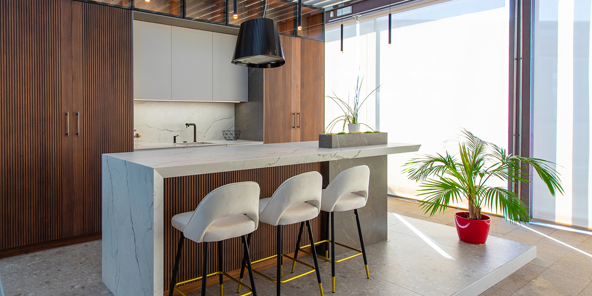 Cocina con península Limestone Greige con la inducción invisible integrada